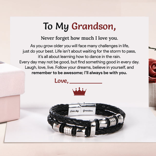 Introducing our "To My Grandson, I Will Always Be With You Bracelet" - a heartfelt token of love. Crafted from genuine braided leather and adorned with stainless steel charms, this bracelet exudes quality and sentiment. At 8.6 inches (21.8cm) in length, it's the perfect fit for any grandson. Cherish this timeless piece as a reminder of our enduring bond. It comes with a heartwarming card message, adding an extra touch of love and warmth to this special gift.